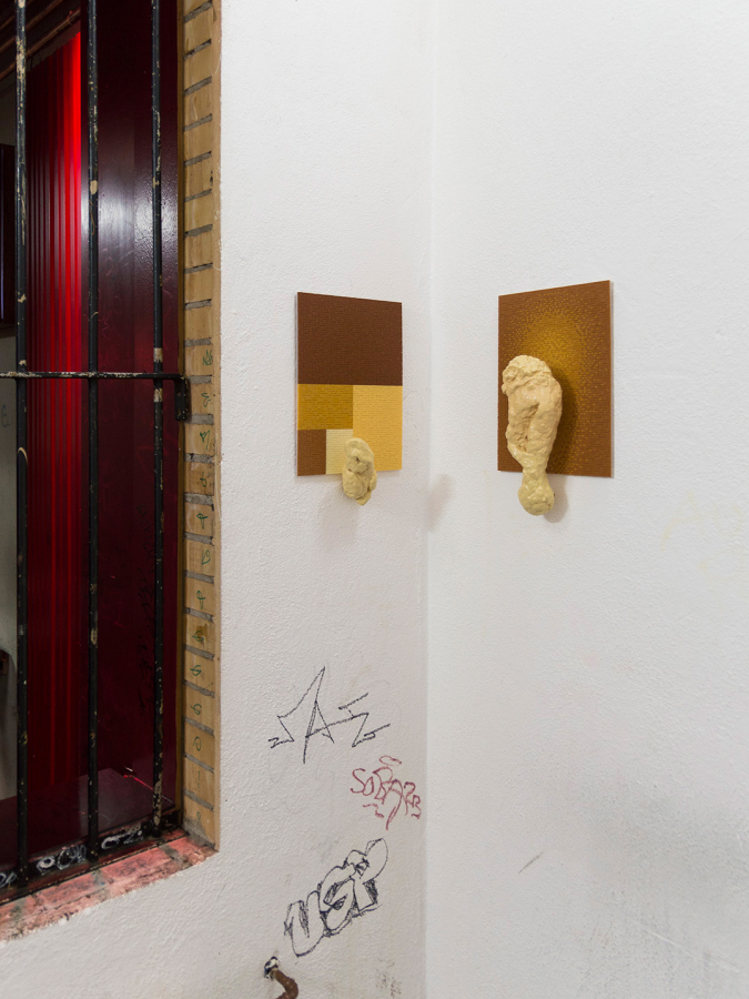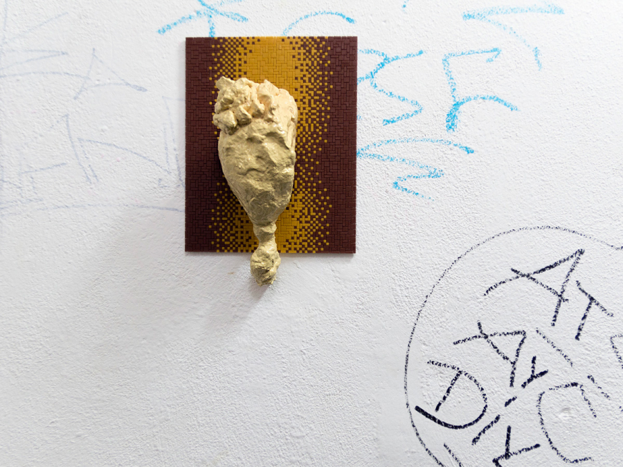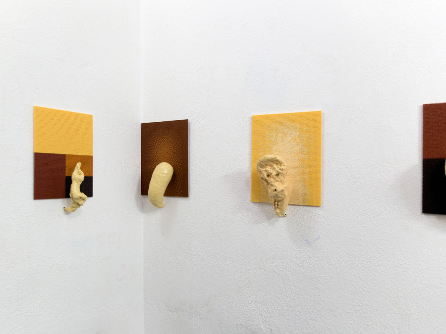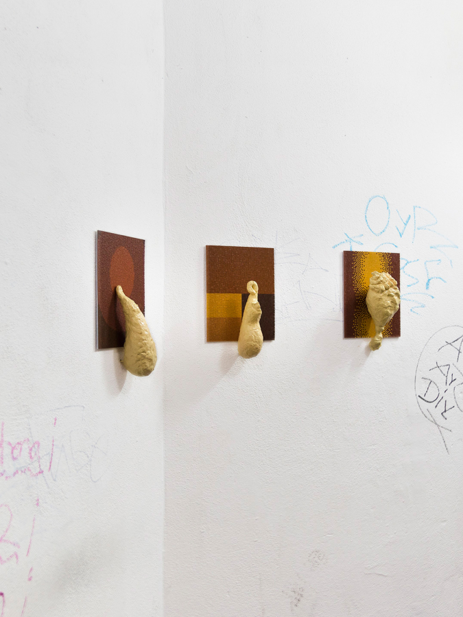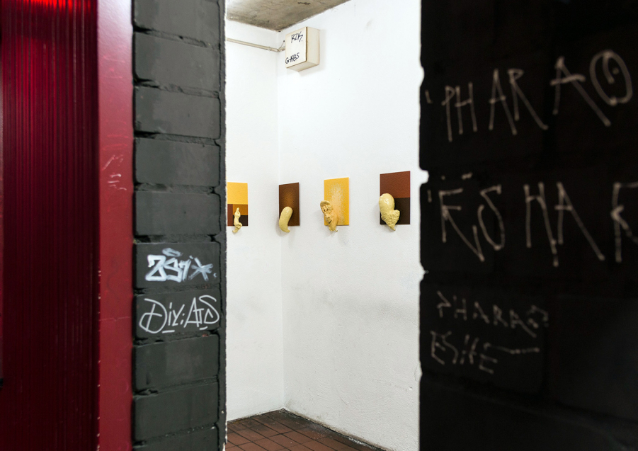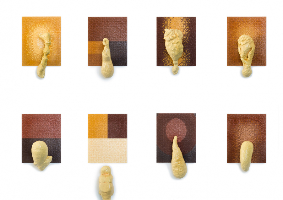 Title or remark: «I can’t believe it’s not» … a what? – simply said: an installation of 12 mixed media works, not cheaper in dozens but richer in its metamorphic qualities. The flat Ministeck background images look like noble colour field paintings with a sophisticated combination of light ochre, brown and reddish dark brown hues, arranged in few geometric partitions, or composed with a darker hue slightly changing to a kind of brighter halo in the centre. The clumsy sculptures were shaped from paper pulp, coated with a thick resin shimmering in bright Beige. Like ectoplasmic emanations they shimmer between different metamorphic impressions. Is this one a mini bunny, and that one a childish Bozzetto of the lower back of Donatello’s David? This one, a recently excavated fragment of a tiny old-time idol, now backward highlighted by a Ministeck halo, and that one a dreamy head looking like too long neglected as mere mud dough? Another one seems to try a way-out as Klein bottle closed onto itself, while a stocking cap seems to disguise a fatso face, coming out of a Ministeck ring of sombre brown halos. An apparently gorgeous misfit heart is pushing one bulging ail out of a furry base, and a hearty stuffed sausage seems to wait on a passage to a honourable ghost, and so on in a protean power of creation.